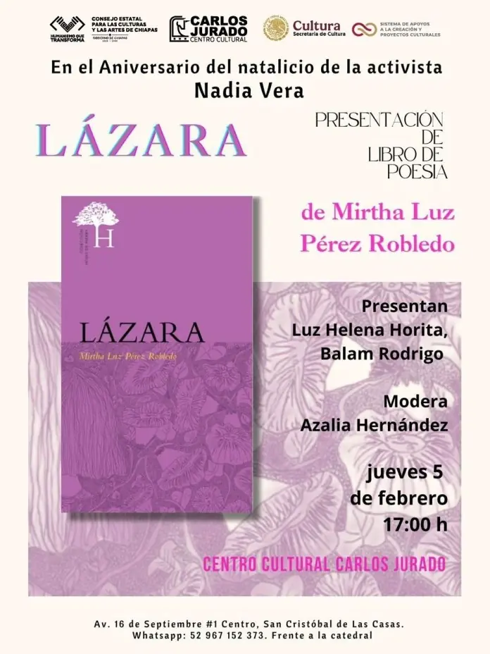 En el marco del aniversario del natalicio de la activista y defensora de derechos humanos Nadia Vera, se llevará a cabo la presentación del libro de poesía “LÁZARA”, una obra de la escritora Mirtha Luz Pérez Robledo. Este evento es una invitación abierta a la comunidad para encontrarse a través de l