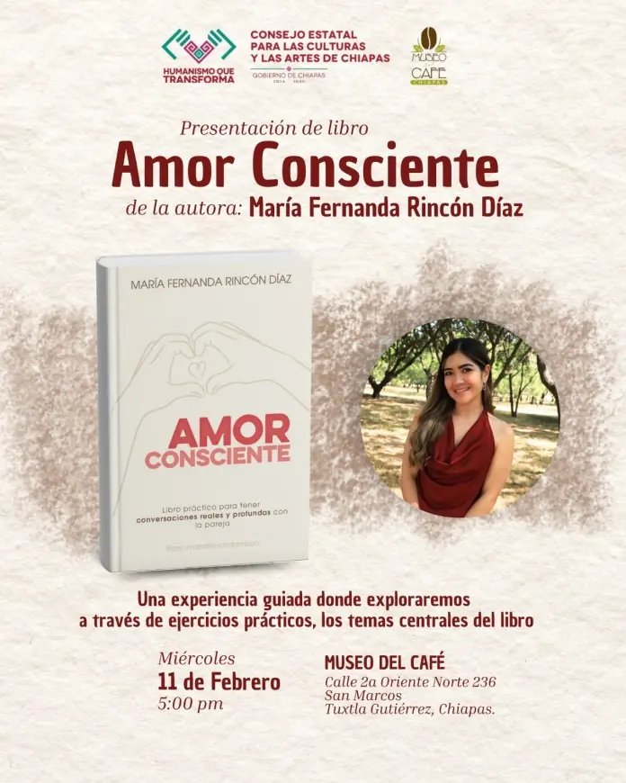¡Atención, Tuxtla Gutiérrez! El Consejo Estatal para las Culturas y las Artes de Chiapas invita a una tarde de reflexión y crecimiento personal. Se llevará a cabo la presentación del libro “Amor Consciente”, de la autora María Fernanda Rincón Díaz.Más que una lectura, esta será una experiencia guia