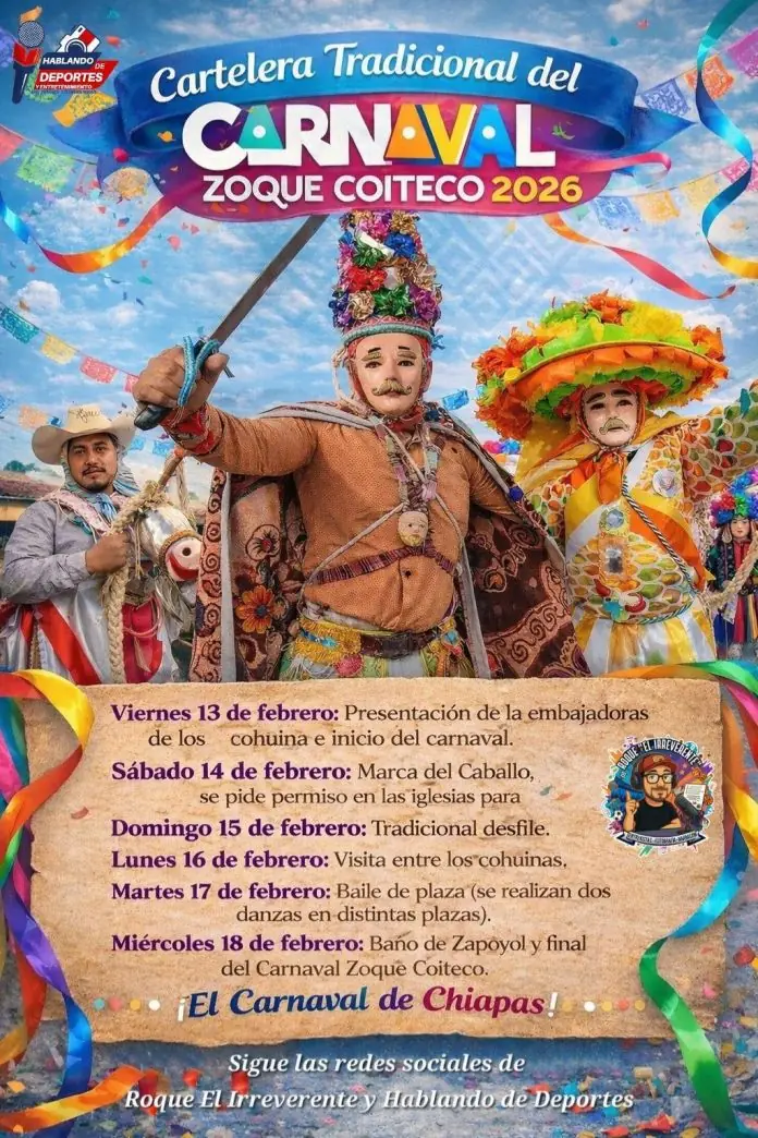 ¡Ocozocoautla está de fiesta! Se ha revelado la Cartelera Tradicional del Carnaval Zoque Coiteco 2026, el evento cultural más emblemático y vibrante de Chiapas. Prepárate para vivir días llenos de color, danza y tradiciones ancestrales que dan identidad a nuestro estado.Desde la presentación de las