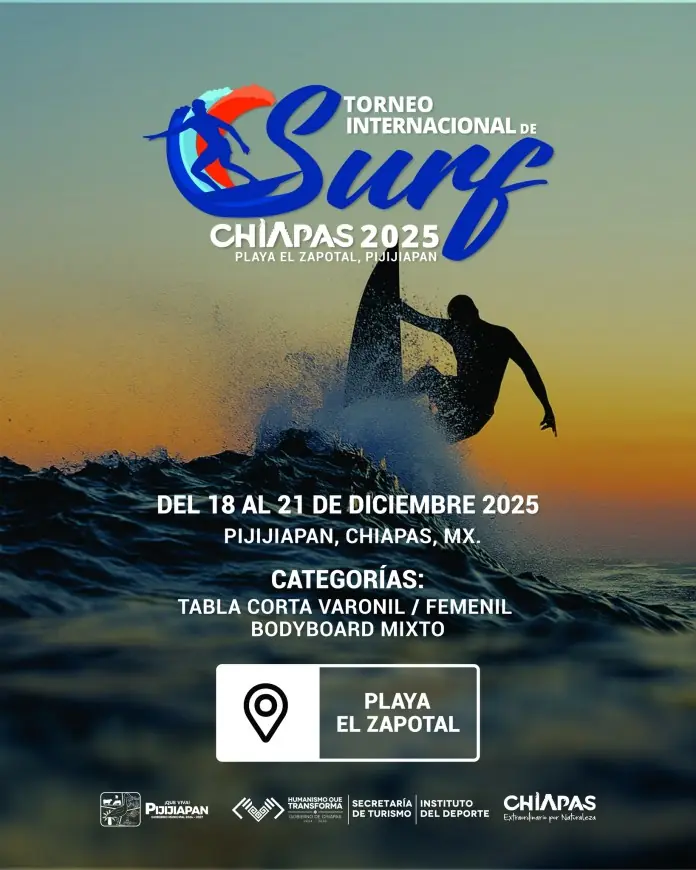 Lugar: Playa El Zapotal, Pijijiapan, Chiapas, MéxicoFecha: Del 18 al 21 de diciembre de 2025Hora: No especificada en la imagen, se sugiere consultar programa oficial.Detalles del Evento: Torneo de surf internacional con surfistas nacionales e internacionales.Categorías: Tabla Corta Varonil, Tabla Co
