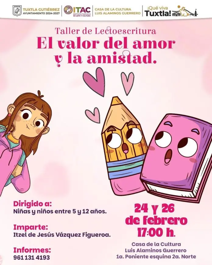 Se invita a las familias chiapanecas a participar en la última sesión de febrero del taller de lectoescritura titulado “El valor del amor y la amistad”.Este evento, que tendrá lugar este jueves 26 de febrero, busca brindar a los menores un espacio creativo para desarrollar habilidades de lectura y e