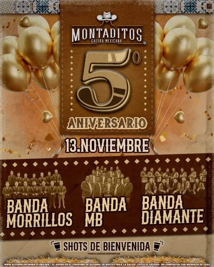Montaditos Galera Mexicana anuncia su gran celebración por su 5to. Aniversario, un evento diseñado para los amantes de la música de banda y la fiesta.La celebración, que promete ser una noche de gran ambiente, contará con la participación estelar de tres reconocidas agrupaciones que pondrán a bailar